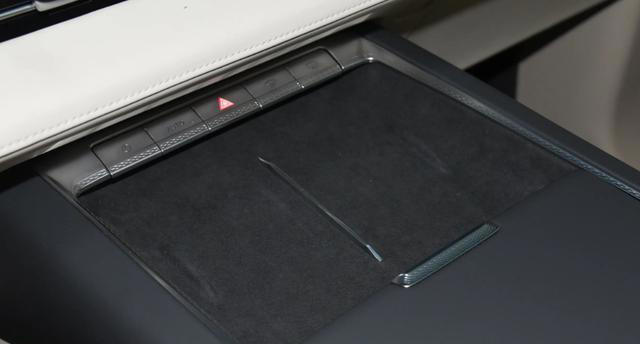 考慮到實用性,車內依舊保留了一排實體物理按鍵,用于控制空調系統。中間設計了懸浮島臺,表面集成了手機無線充電面板、杯架,島臺下方采用鏤空設計,方便收納一些隨身物品。中央扶手箱內集成了一個冰箱,只不過內部容積不是很大,優點就是制冷制熱都挺快,同時溫度調節范圍比較廣。