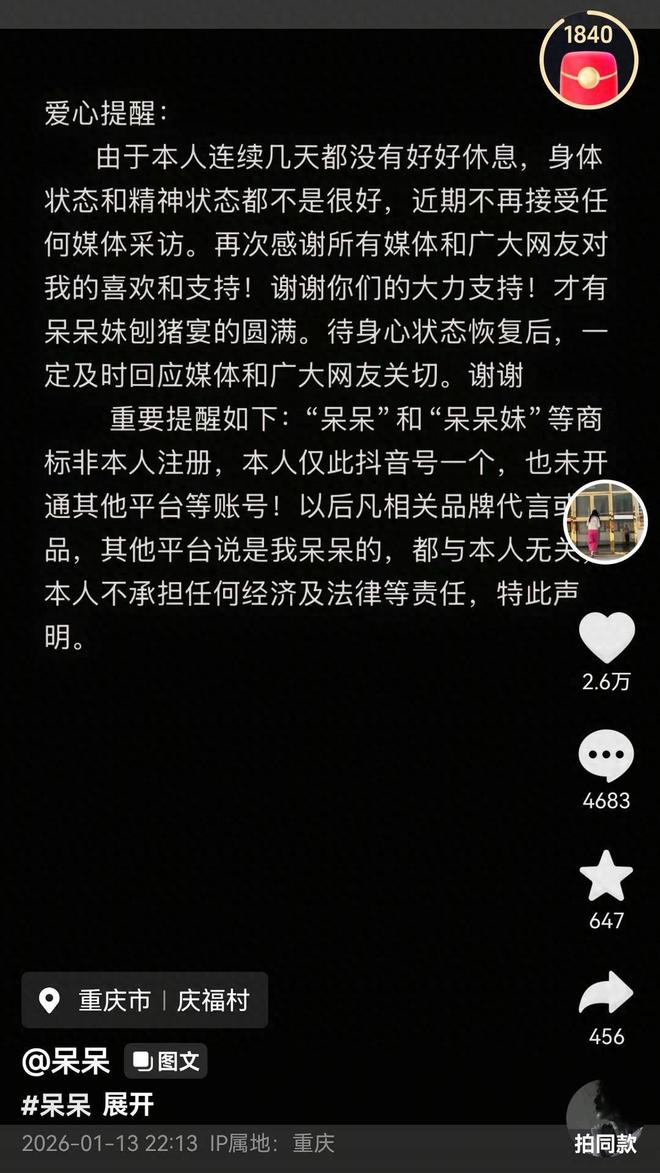 1月13日,因“殺年豬帶動合川走紅”引發關注的網紅“呆呆”通過其抖音賬號發布聲明,稱因連續多日未休息好,身體與精神狀態欠佳,近期將不再接受任何媒體采訪,同時就商標權屬、賬號運營及品牌合作等問題作出澄清。