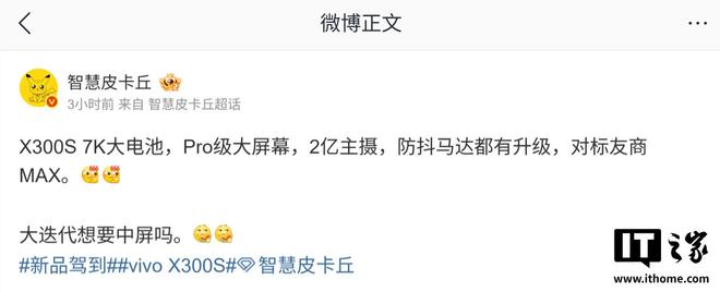1 月 18 日消息,博主 @智慧皮卡丘 今天在微博透露,某廠的 X300s 手機將搭載 7K 級大電池。