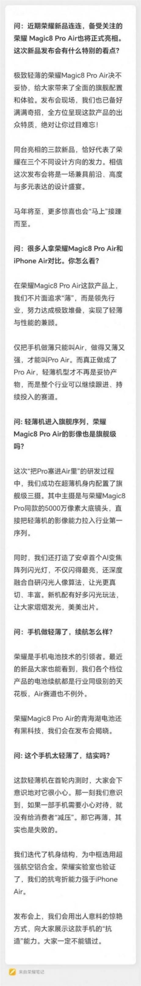 對于如何看待很多人將榮耀Magic8 Pro Air與iPhone Air對比的問題,方飛表示,在榮耀Magic8 Pro Air上,榮耀不片面追求"薄",而是領先行業(yè),達成極致堆疊,實現(xiàn)輕薄與性能兼顧。